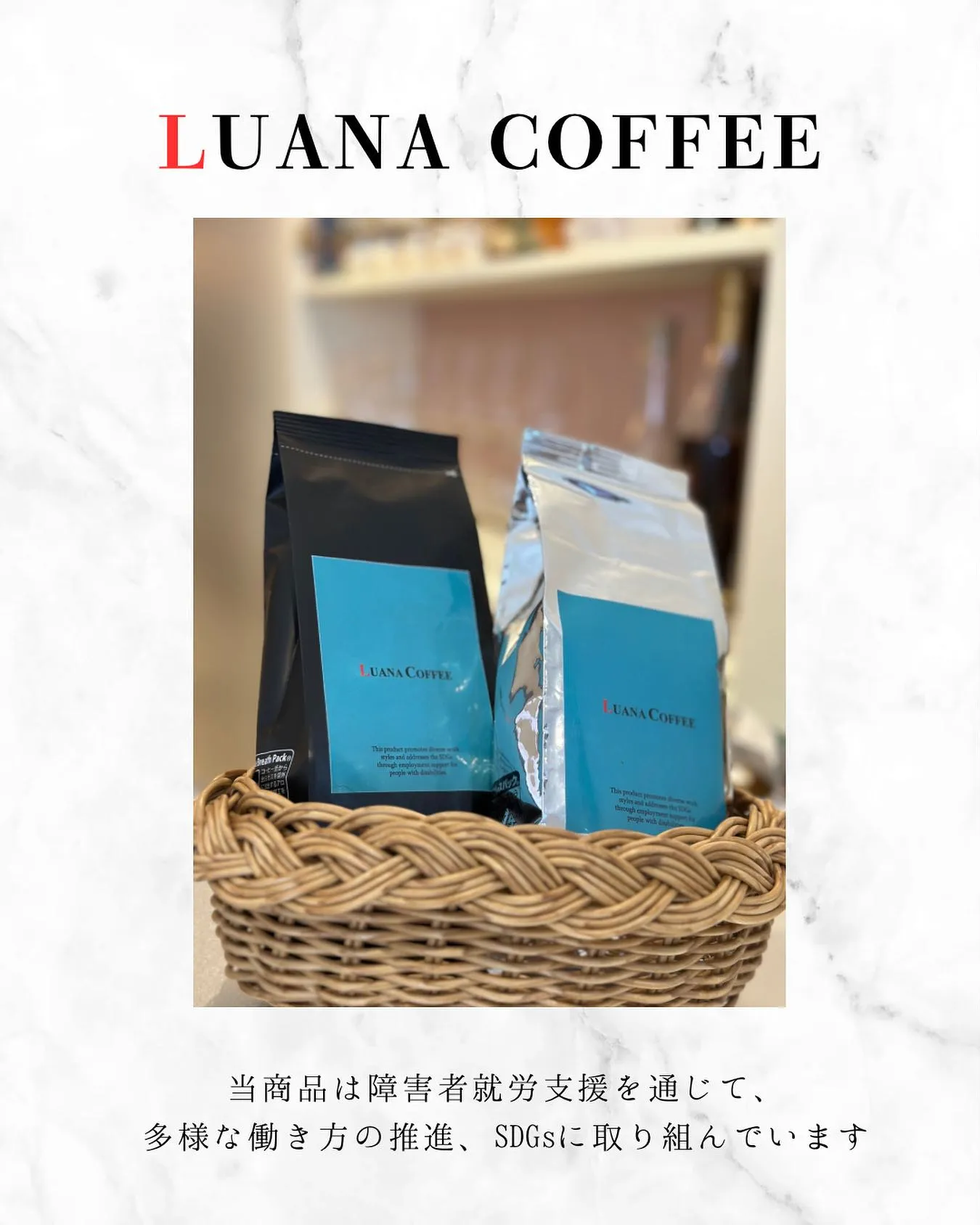 LUANAのオリジナルコーヒーは、福祉施設(就労継続支援A型)で働く方々が、一粒一粒丁寧に選別・梱包し、心を込めて仕上げています。