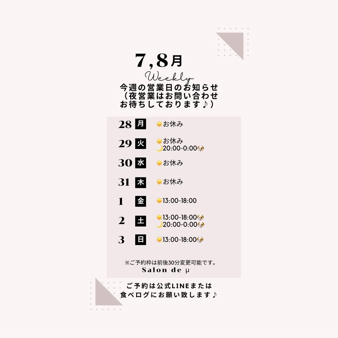 来週の営業日です♪ 8月から月曜〜木曜日までのお昼のイートインは完全予約制とさせていただきます。 よろしくお願い致します。